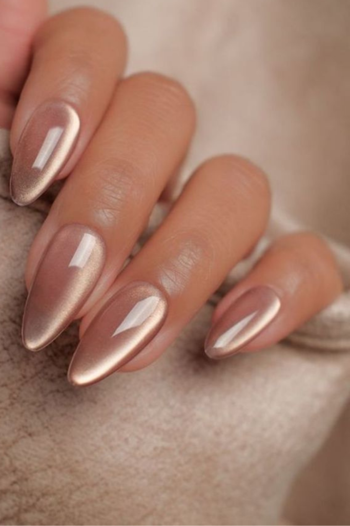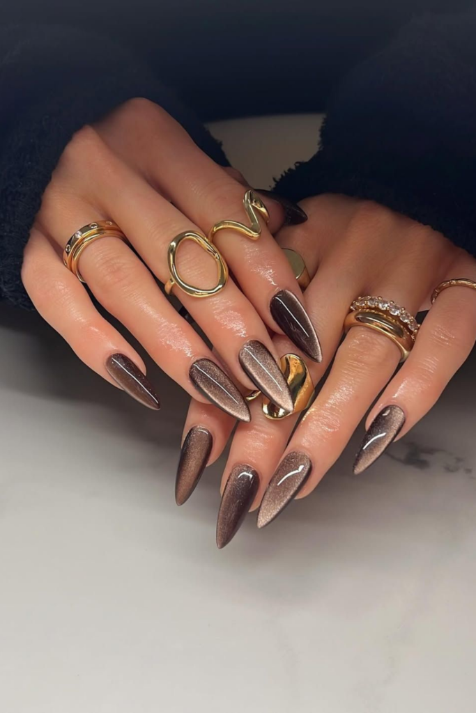 For a sharper, more dramatic look, these stiletto-shaped nails use a silver-brown magnetic pigment to create a high-contrast ‘lit-from-within’ effect.