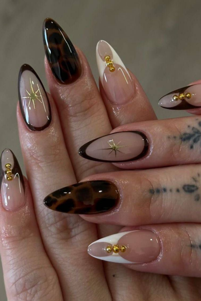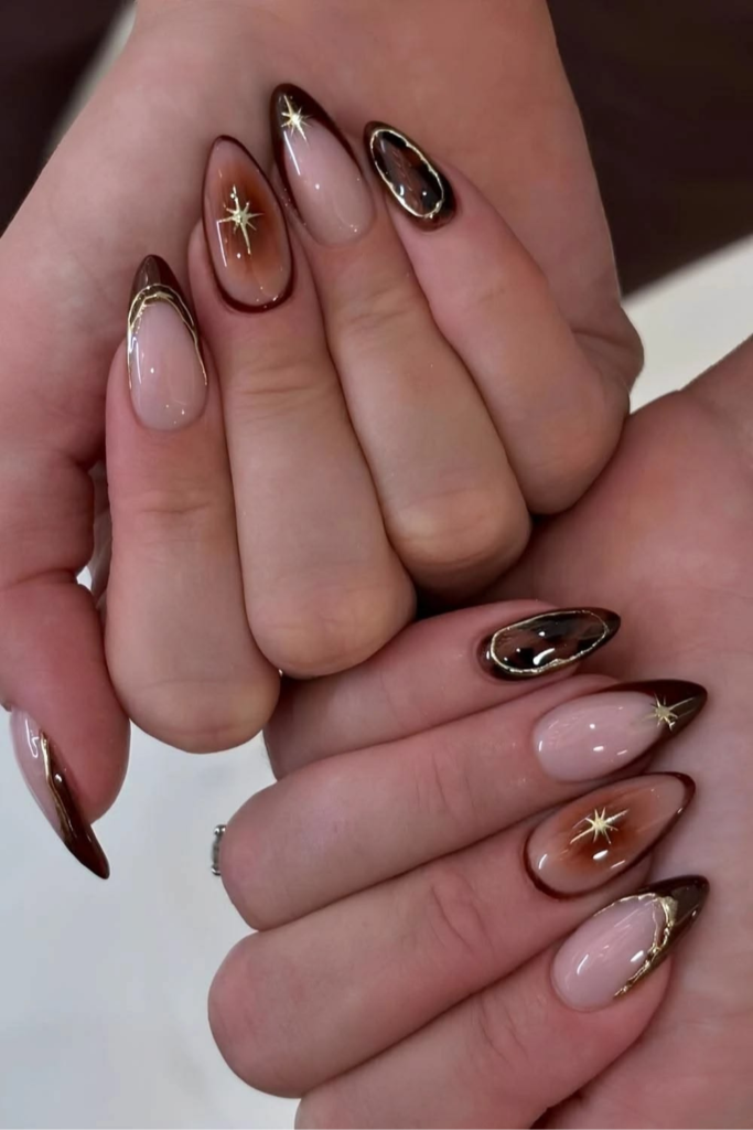 A stunning hybrid design featuring cat-eye French tips, hand-painted stars, and a soft tortoise shell ombré that feels incredibly modern.