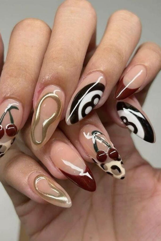 This playful set pushes the boundaries by mixing leopard prints, cherry motifs, and 3D gold swirls over a magnetic base for a truly eclectic vibe.