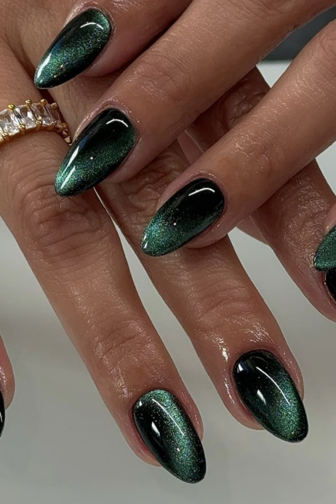 These deep emerald nails capture the ‘Northern Lights’ effect perfectly, with green magnetic shimmer that seems to float over a black abyss.
