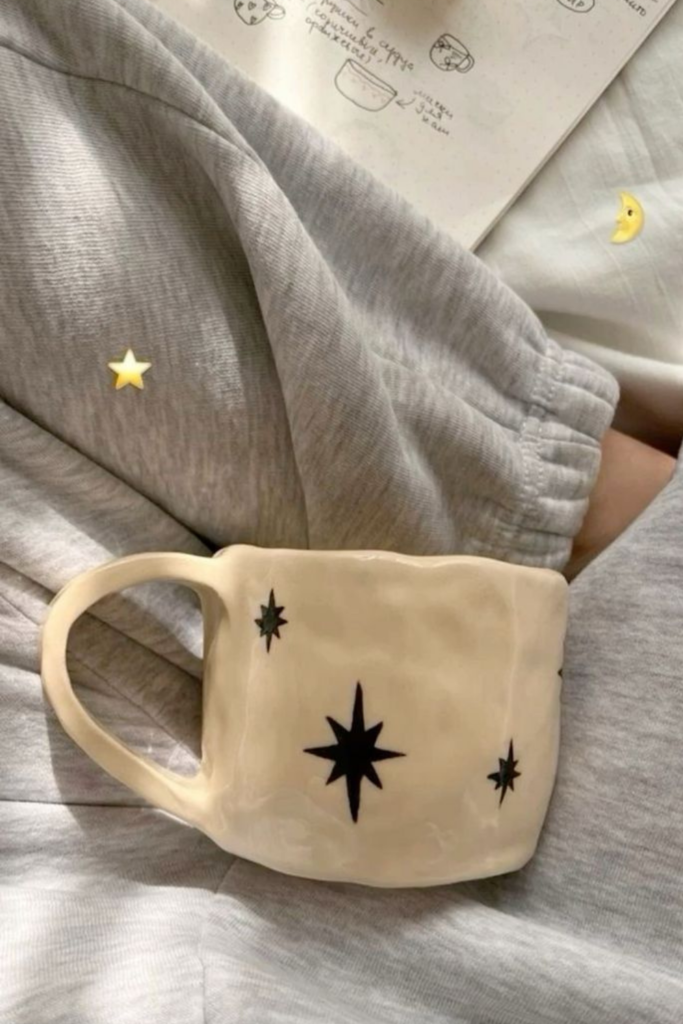 A cozy, cream-colored mug with black stars. It looks so peaceful sitting on those grey sweatpants. It is a great example of the „homebody” vibe we are going for.