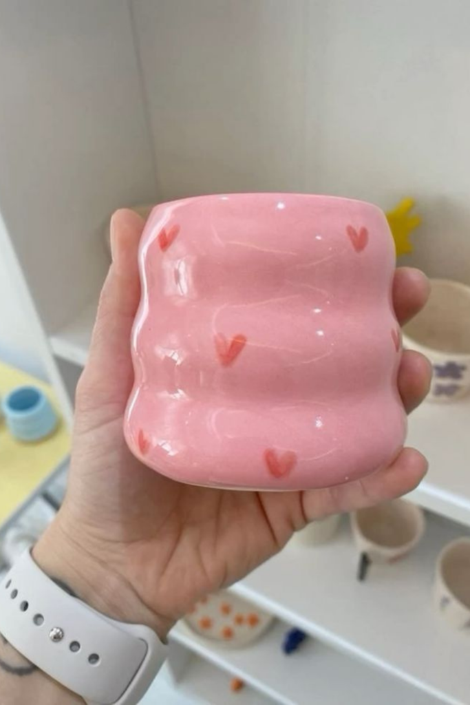 This wavy pink mug is so fun. The „wiggly” shape is very trendy right now. It shows that your mug does not have to be perfectly straight to look amazing.