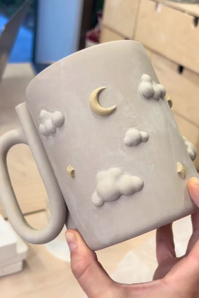 Here is a mug in the making. You can see the tiny 3D clouds and the moon. It shows how easy it is to add details before the clay gets hard.