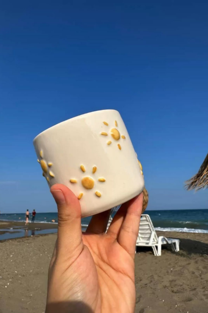 This sunny mug looks great at the beach. The yellow suns are raised up from the surface. It shows how a simple pattern can make a big statement.