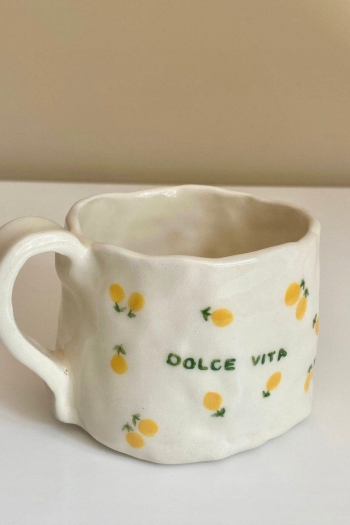 This „Dolce Vita” mug has tiny lemons painted all over it. The shape is a bit uneven, which is why it looks so charming and real.