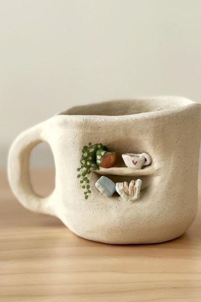 This mug is so creative. It has a tiny „shelf” built right into the side with a little plant and book. It shows that your mugs can be works of art, not just cups.
