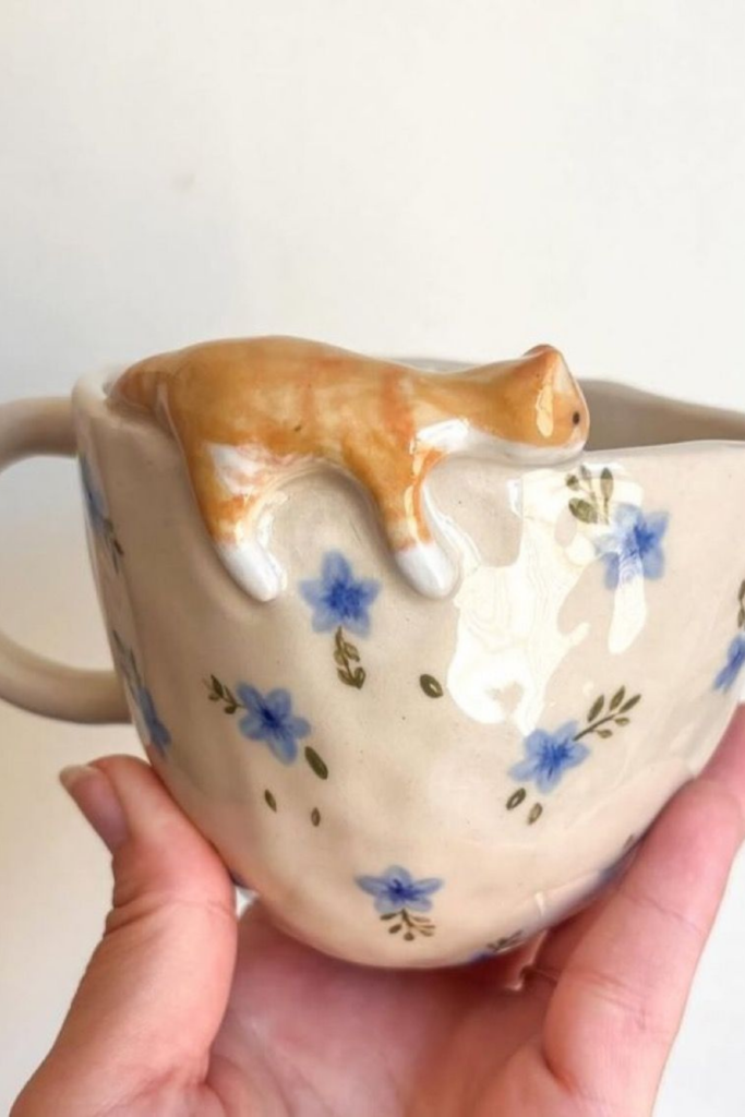 Look at this cute ginger cat peeking over the rim! The blue flowers are painted so softly. This is a perfect example of adding a „3D” friend to your pottery.