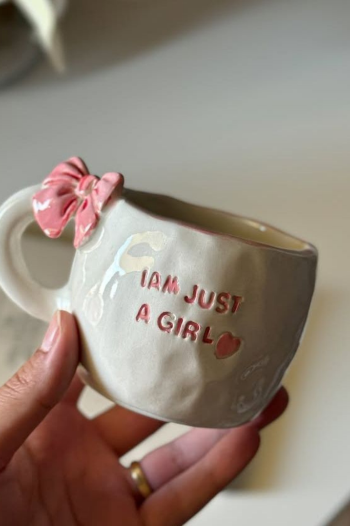 This mug has a pink bow on the handle and says „I am just a girl.” It is very playful and would be a fun project to make with a friend.