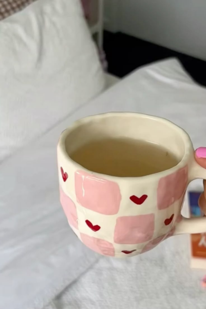 The pink checkers and red hearts on this mug are so cute. This looks like the perfect cup for a morning matcha in bed.