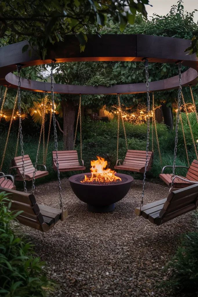 How incredible is this setup with the swinging chairs? It’s such a playful and unique take on fire pit seating. The circular overhead frame ties the whole design together and makes it feel like a private oasis.