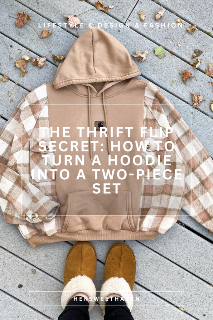 This is one of the most popular thrift flip ideas on social media right now, and it’s easier than it sounds. Take a plain hoodie (oversized works best) and swap out the sleeves with flannel or plaid fabric. You can go even further by cutting the hoodie at the waist and using the leftover fabric to create a matching accessory or layering piece.