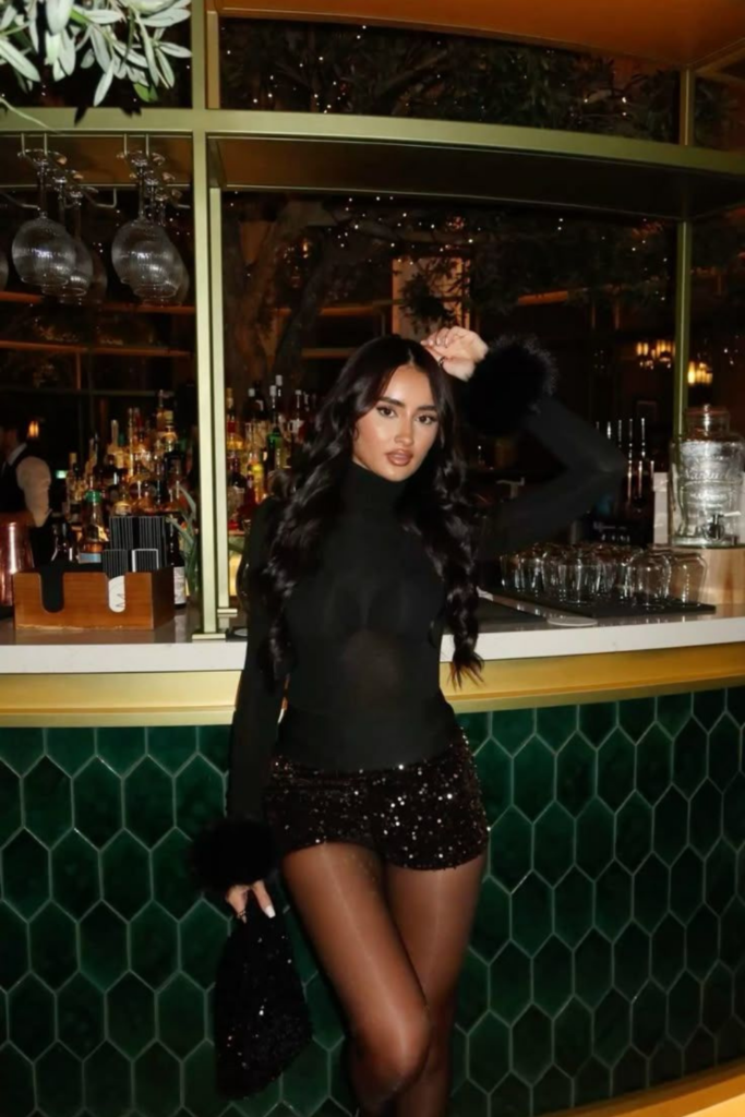 If you want to add some sparkle, look at this next style. This outfit uses a black turtleneck with fun, sequin shorts. The fur cuffs on the sleeves are such a trendy 2026 detail. It is a smart way to wear sparkles without feeling like a disco ball. This would be amazing for a night at a fancy cocktail bar.